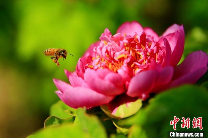 中新网徐州4月16日电 (记者 朱志庚) 4月16日,位于微山湖西畔的江苏沛县杨屯镇的南山牡丹园40000余株牡丹进入盛花期,姹紫嫣红,花团锦簇,蔚为壮观,成为春天里“最美花事”。