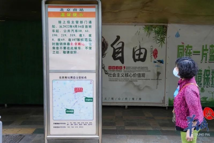 此外,该路段上原有一个北京南站的公交车站点。原本显示车辆信息的站牌在当天也改成了温馨提示,显示从2022年4月16日首班车起,公共汽车10、61、190、219、519、夜1、夜8、夜69、夜107等线路临时撤销停靠北京南站,请乘客不要在此候车。温馨提示的下方,则给出了附近万福西站和泰康路站的公交站点地图指引。记者遇到一位长者阿姨正准备在此站乘车,了解站点撤销后,她颇有些失望。