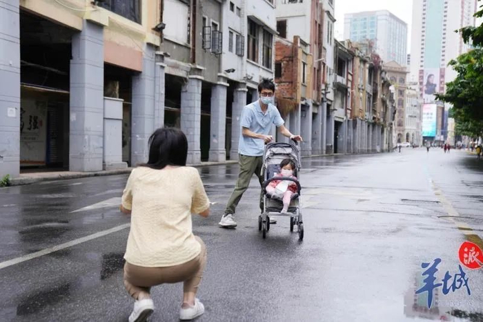 由于当天是北京路南段试行全日化步行管理首天,记者在现场还遇到了前来拍照见证的一家三口。一对年轻的夫妇带着还坐着婴儿车的宝宝,一起在无车行驶的路段中间拍照。