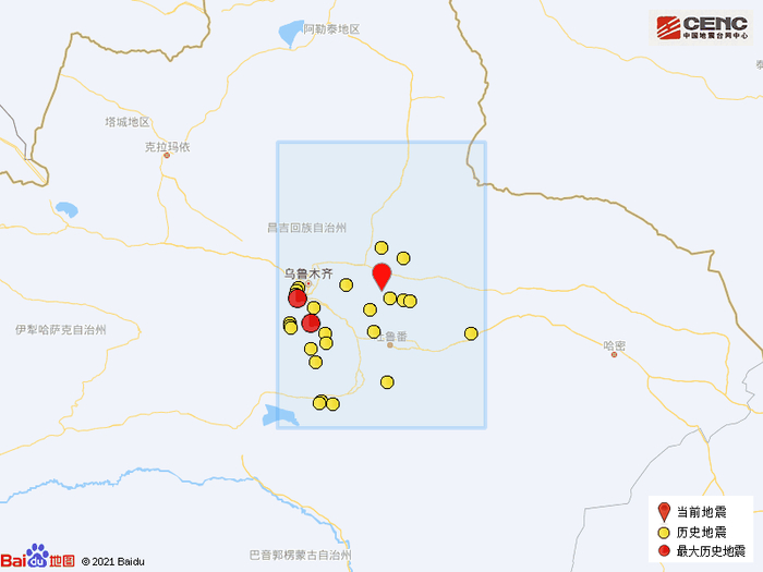 历史地震:根据中国地震台网速报目录,震中周边200公里内近5年来发生3级以上地震共27次,最大地震分别是2020年8月8日在新疆吐鲁番市托克逊县发生的4.8级地震(距离本次震中127公里)和2018年1月20日在新疆乌鲁木齐市乌鲁木齐县发生的4.8级地震(距离本次震中132公里),历史地震分布如图。