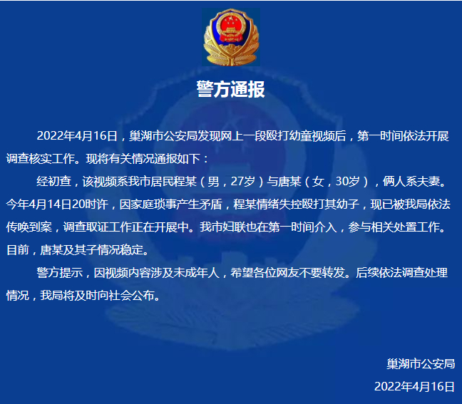 新京报讯 据巢湖公安官微消息,2022年4月16日,巢湖市公安局发现网上一段殴打幼童视频后,第一时间依法开展调查核实工作。现将有关情况通报如下: