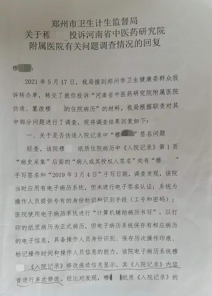 让穆强意想不到的是,在这份复函中,郑州市卫生计生监督局还提到了其发现的其他问题——穆先生的《入院记录》内容被多次修改。