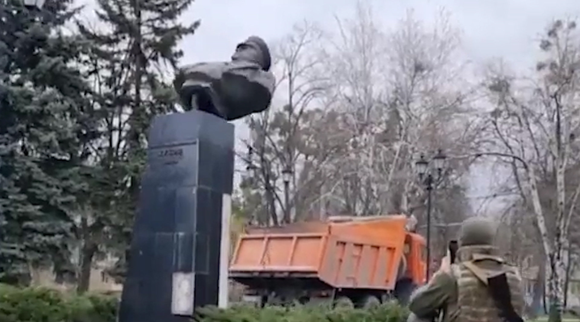 4月17日,哈尔科夫市朱可夫半身雕像正被移除。图源:俄媒视频截图