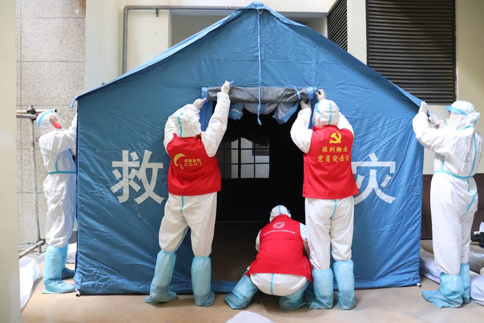 ▲ 2021年,成都一小区物业党员突击队联合社区一起为因疫情滞留在小区内的工人搭建帐篷,负责生活保障。住房和城乡建设厅供图