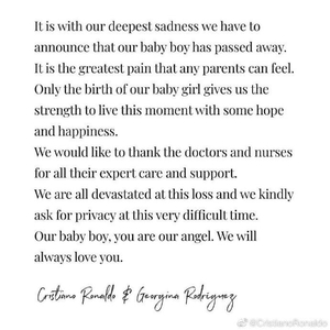 “深切的悲痛,我们的小男孩夭折了。作为父母,这是最大的痛苦。小女孩出生了,我们会带着力量、希望,度过艰难的时刻。我们的宝贝,我们的天使,永远爱你。”
