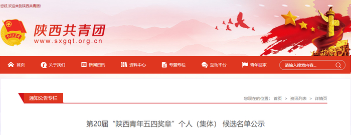 经过基层推荐、资格复核、评委投票等程序,现将第20届“陕西青年五四奖章”个人(集体)候选名单予以公示,进一步听取群众意见,接受社会监督。如对公示的人选(集体)有异议,请于公示期内以实名方式反映。