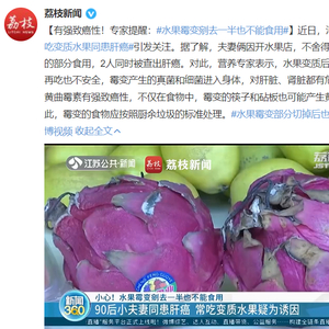 发霉腐烂:微生物产生的毒素会随着汁水在水果内部扩散,我们不能用肉眼判断毒素的扩散范围。所以,即便切掉水果的腐烂部分,剩下的也不能保证不含有毒素,建议将霉变水果直接整个扔掉。