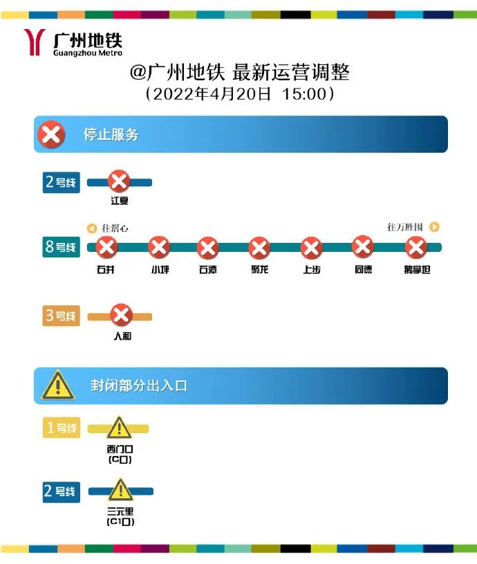 4月20日15:00起,广州地铁二号线三元里站除C1口封闭外恢复正常运营,七号线员岗站E、F、G口恢复正常进出站。截至目前,线网共9个站点停止对外服务,包括:二号线江夏,八号线鹅掌坦、同德、上步、聚龙、石潭、小坪、石井,三号线人和。共2个站点封闭部分出入口,包括:一号线西门口站C口,二号线三元里站C1口。