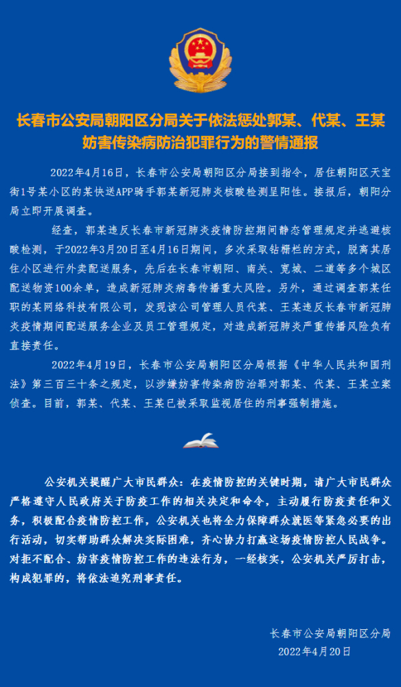 2022年4月19日,长春市公安局朝阳区分局根据《中华人民共和国刑法》第三百三十条之规定,以涉嫌妨害传染病防治罪对郭某、代某、王某立案侦查。目前,郭某、代某、王某已被采取监视居住的刑事强制措施。