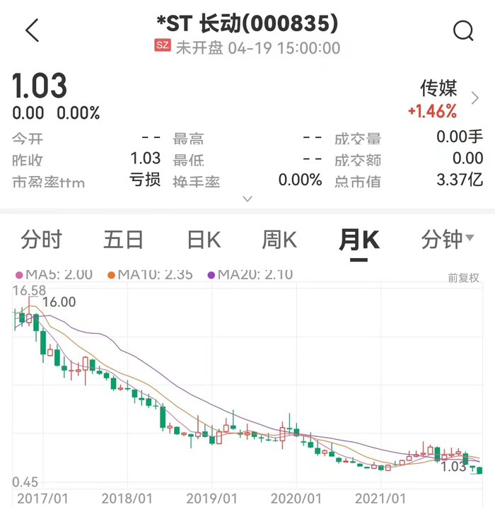 截至3月24日,*ST长动股价为1.03元,市值只有3.37亿元。