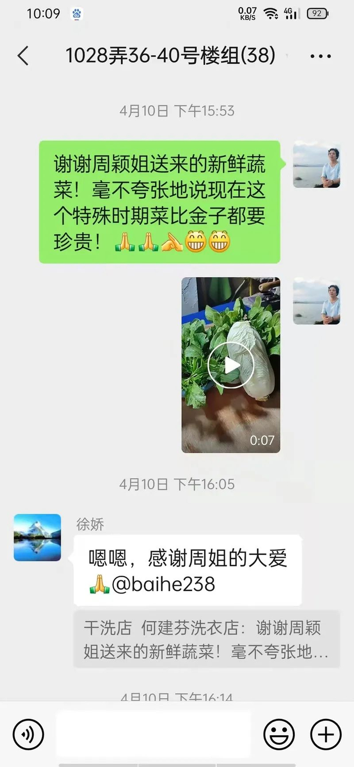 消息发出后不久,一位热心居民周颖阿姨就立即响应:“我家里有多的菠菜、豆腐和十斤东北大米,可以先给你们应急。”随后,周颖就请志愿者帮忙把菜送了过来。