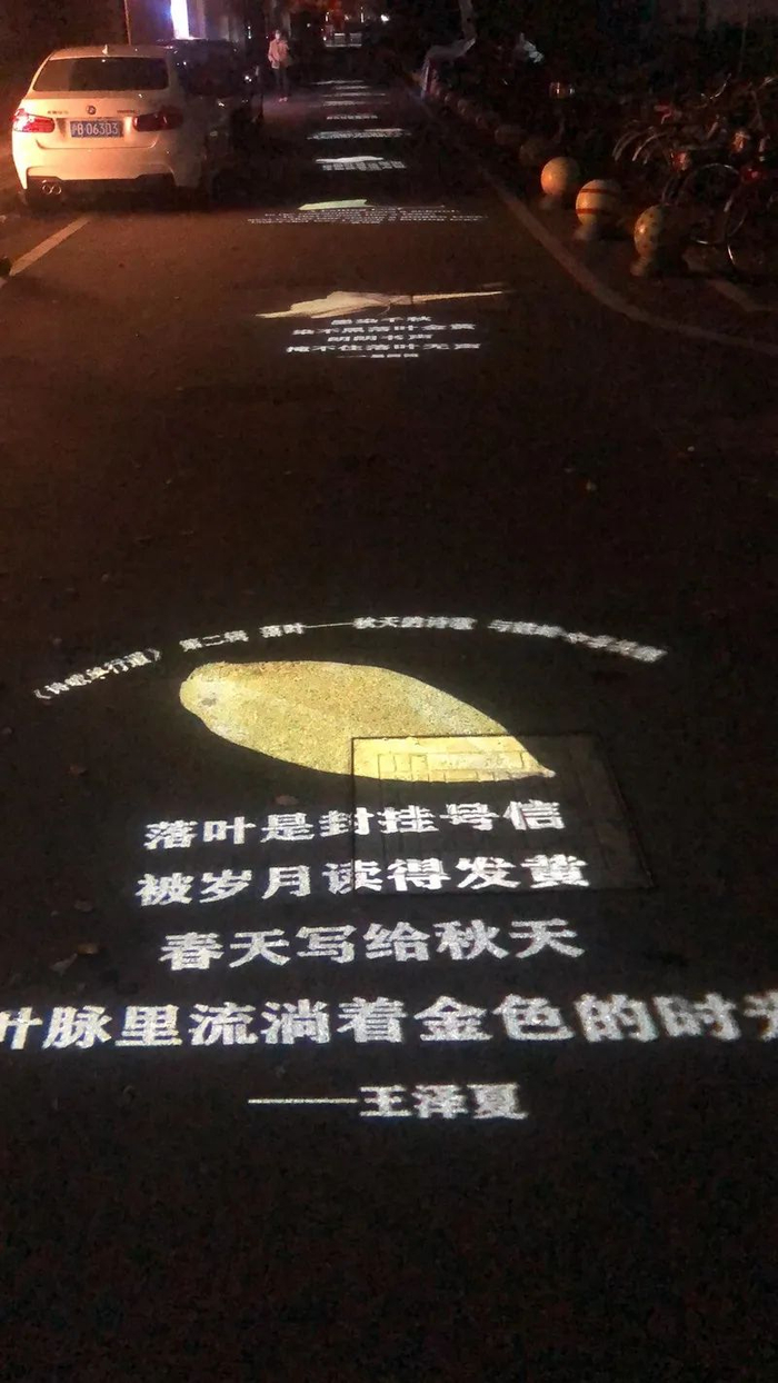 疫情以前,1028弄的“诗歌单行道”一直是网红打卡地,每到晚上,投影在单行道上的诗歌便吸引许多行人在此驻足。由于设置了定时装置,这段时间,1028弄的“诗歌单行道”每天晚上6时仍准时亮灯。