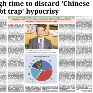 4月19日,驻孟加拉国大使李极明在孟加拉国主流英文媒体《金融快报》发表题为《摒弃“中国债务陷阱”谬论刻不容缓》的署名文章。全文译文如下: