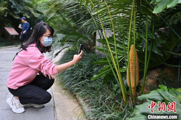 苏铁花开,吸引游人围观拍照。 俞靖 摄