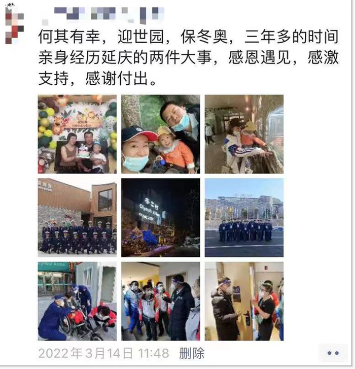 ▲3月14日,北京冬残奥会闭幕次日,刘敬豪在微信朋友圈表示,“迎世园,保冬奥,亲身经历延庆的两件大事,何其有幸。” 受访者供图