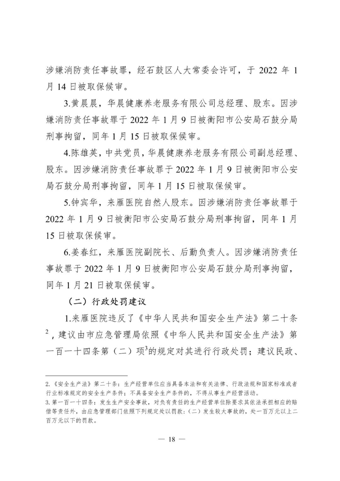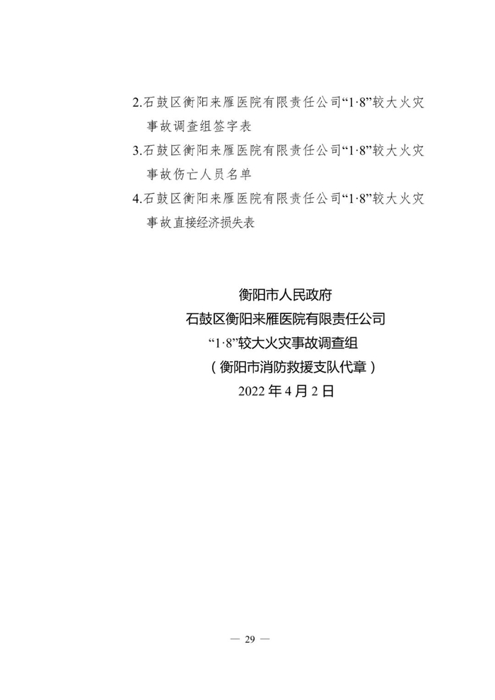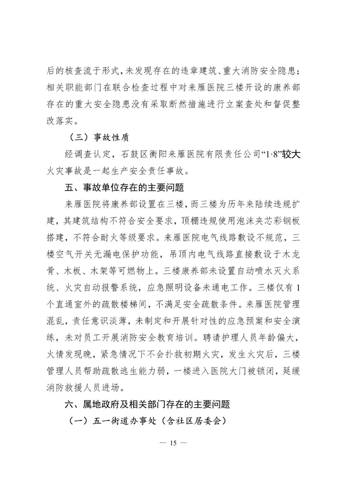 经调查认定,石鼓区衡阳来雁医院有限责任公司“1·8”较大火灾事故是一起生产安全责任事故。