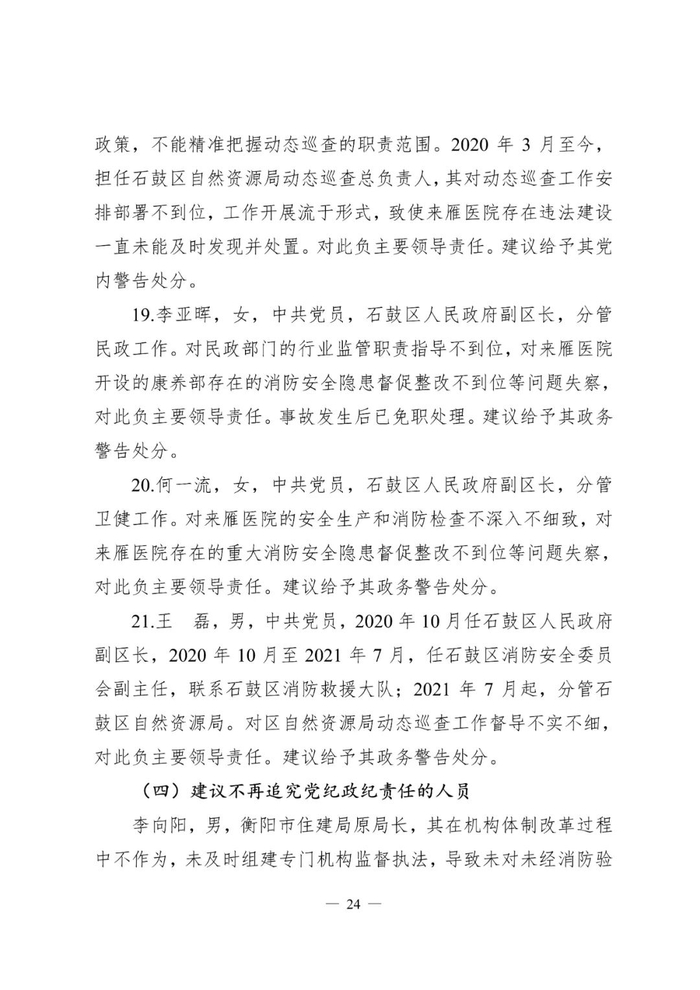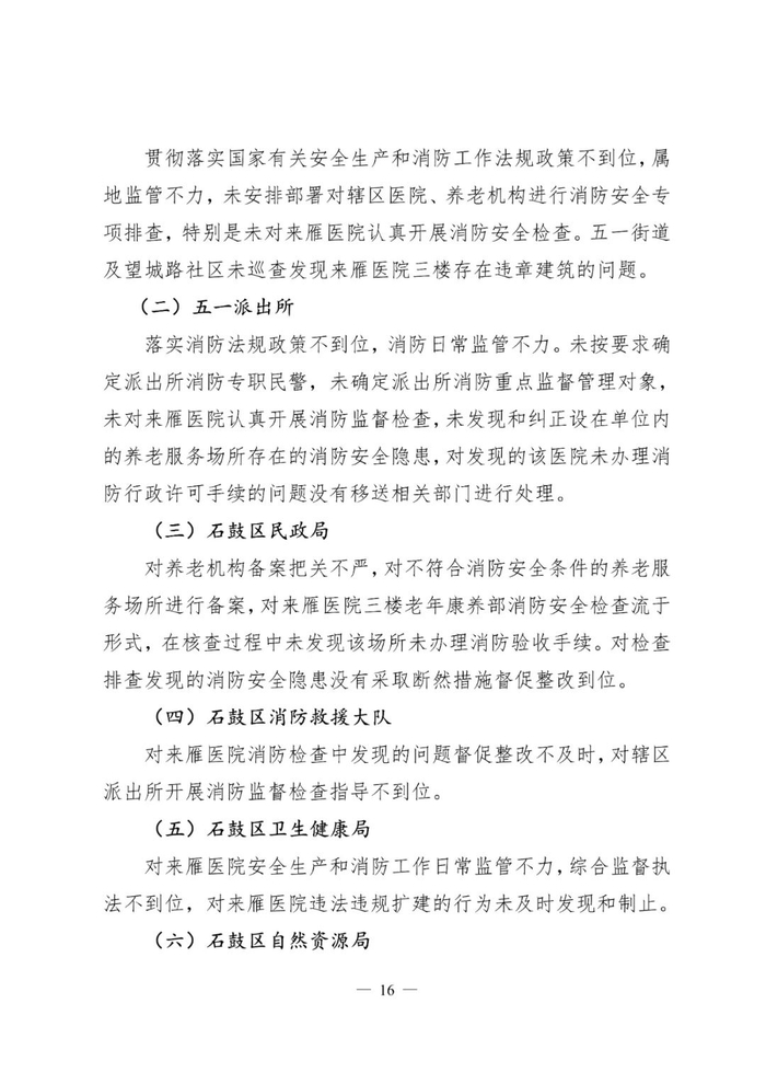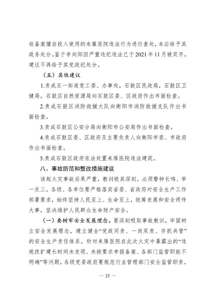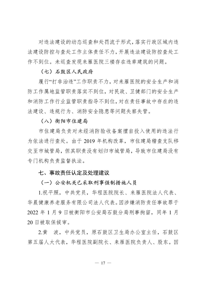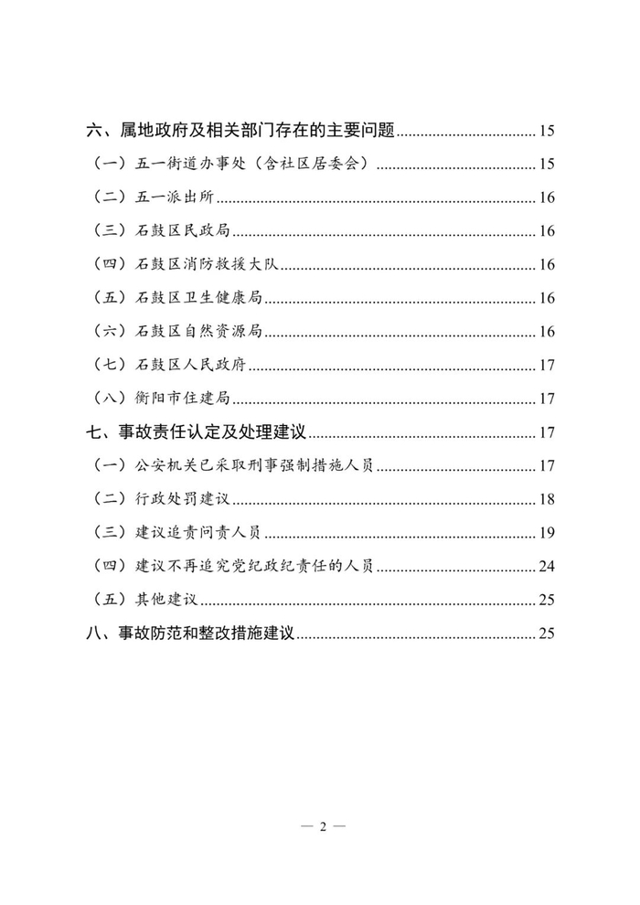 对此,辖区街道办事处、派出所、石鼓区消防救援大队、卫生健康局、民政局、自然资源局、人民政府和衡阳市住建局多家单位和多名负责人被问责处理。