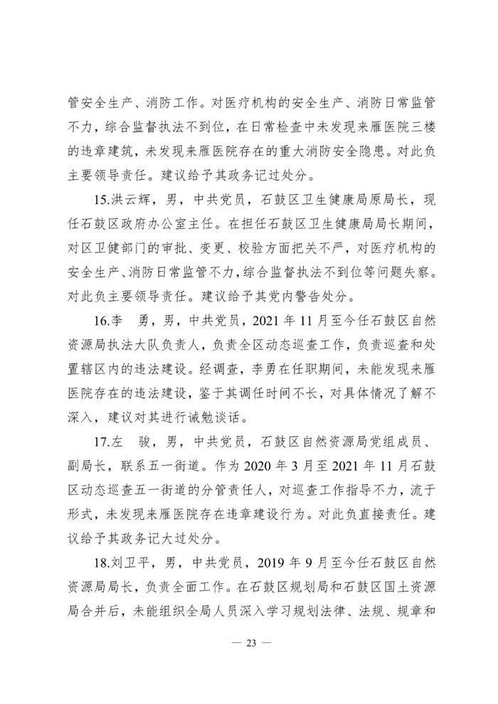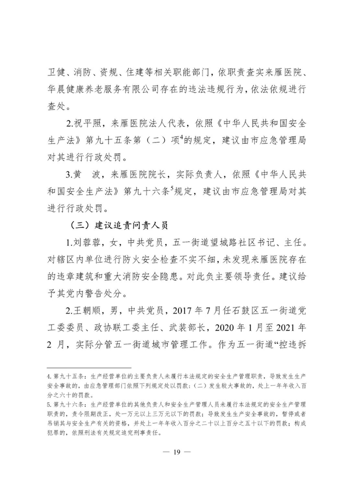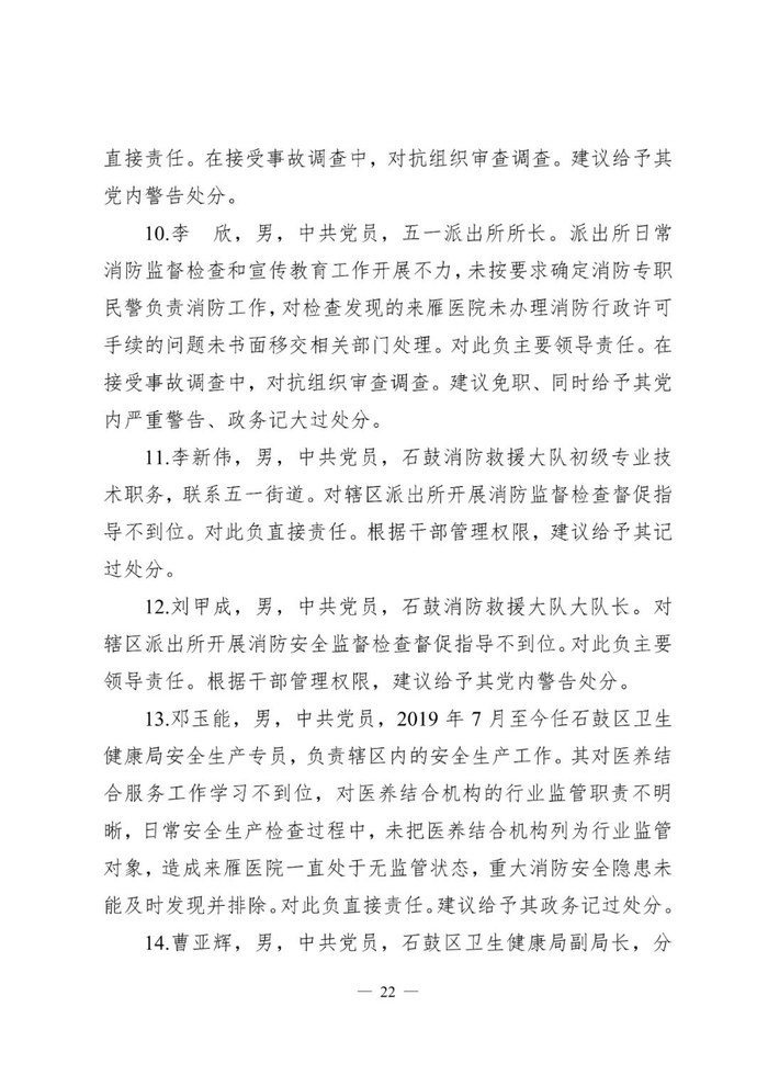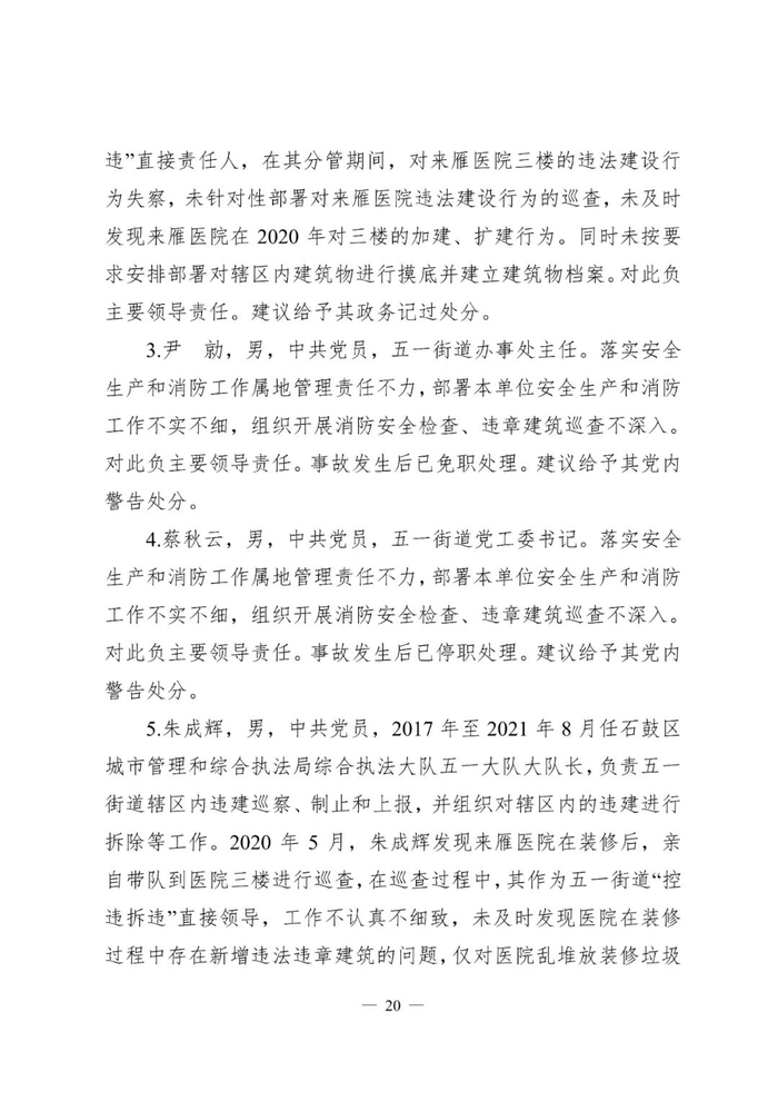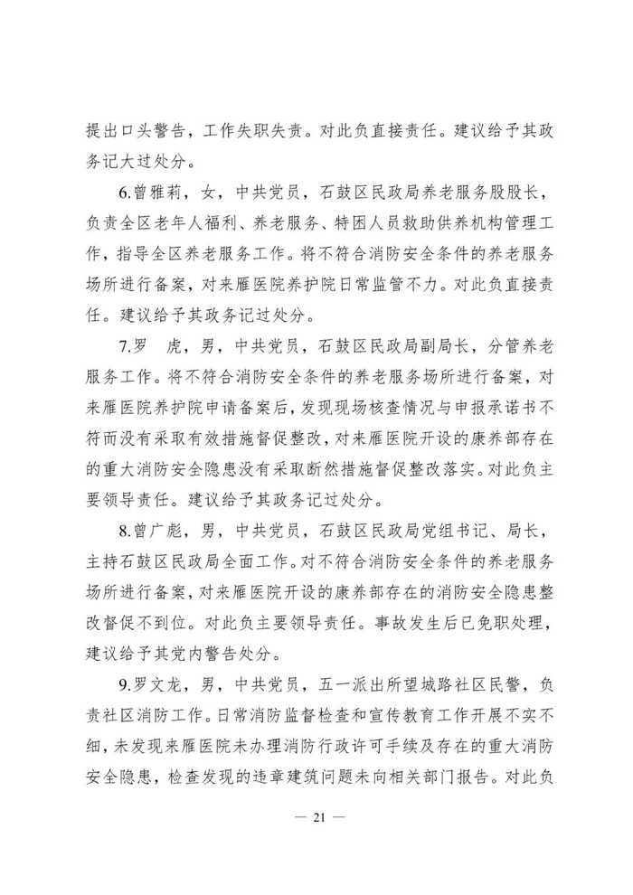 对此,辖区街道办事处、派出所、石鼓区消防救援大队、卫生健康局、民政局、自然资源局、人民政府和衡阳市住建局多家单位和多名负责人被问责处理。