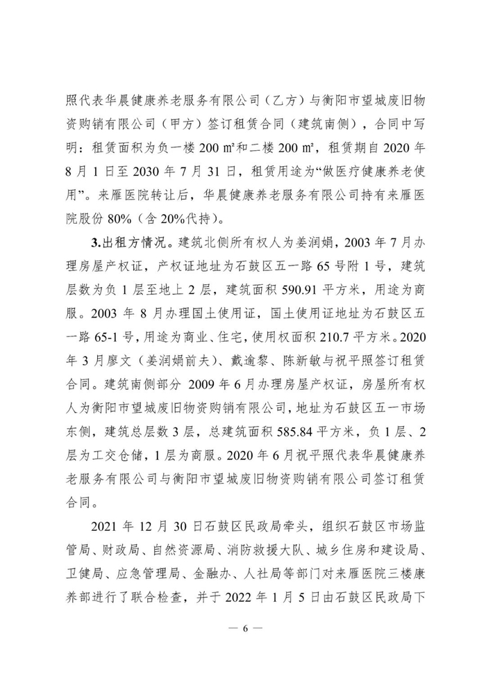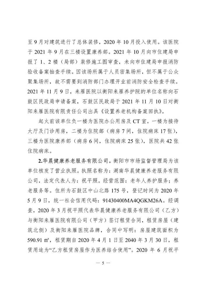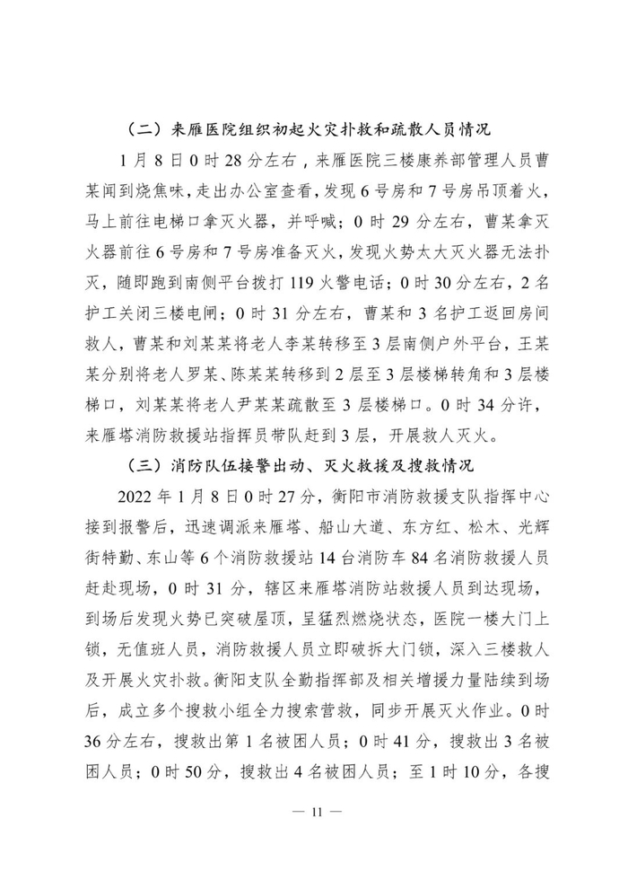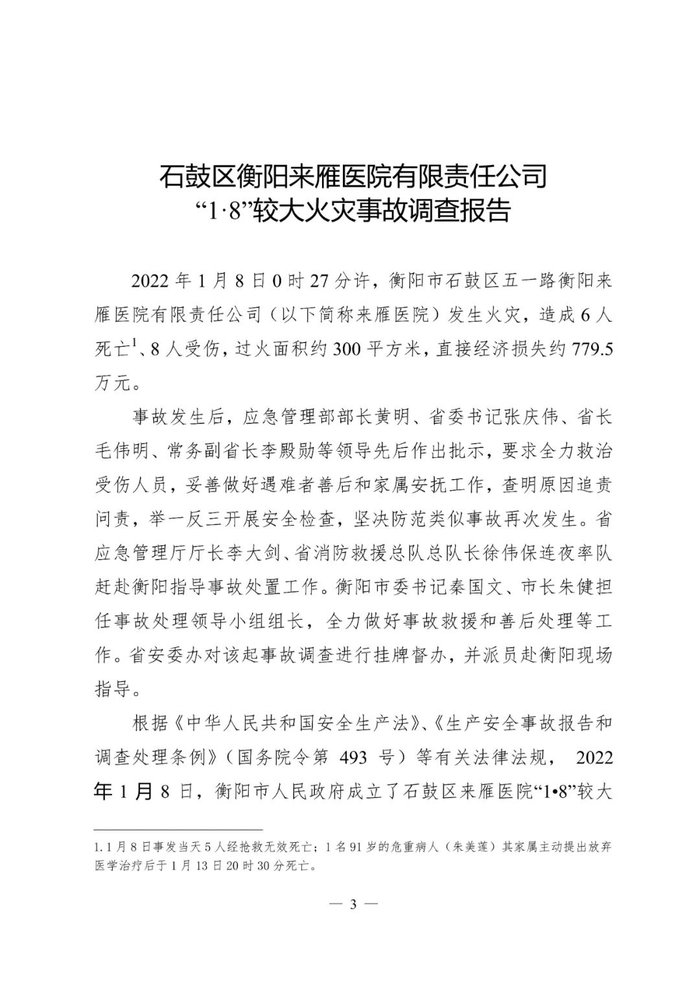 2022年1月8日0时27分许,湖南省衡阳市石鼓区五一路衡阳来雁医院有限责任公司(以下简称来雁医院)发生火灾,造成6人死亡、8人受伤,过火面积约300平方米,直接经济损失约779.5万元。