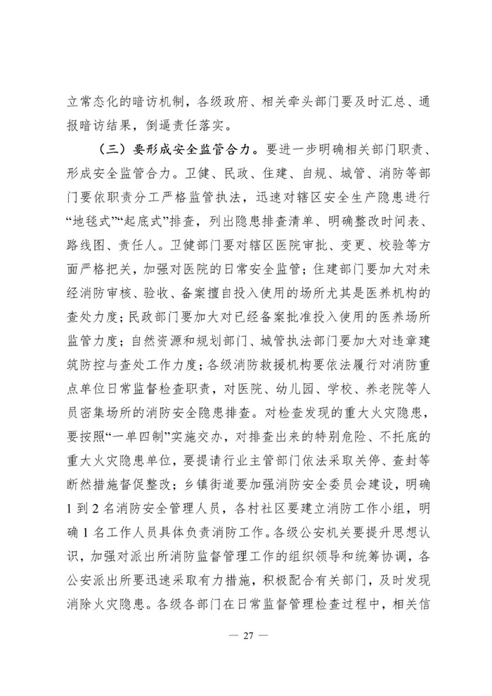 事故调查报告显示,医院违章改造扩建部分未依法到卫健部门进行备案变更;向民政部门申请备案的养老机构资料与现场明显不符;三楼康养部消防设施设置不符合要求,日常消防安全管理严重缺失;起火当日医院一楼大门上锁,无值班值守人员。民政部门对来雁医院三楼老年康养部申报备案—15—后的核查流于形式,未发现存在的违章建筑、重大消防安全隐患;相关职能部门在联合检查过程中对来雁医院三楼开设的康养部存在的重大安全隐患没有采取断然措施进行立案查处和督促整改落实。