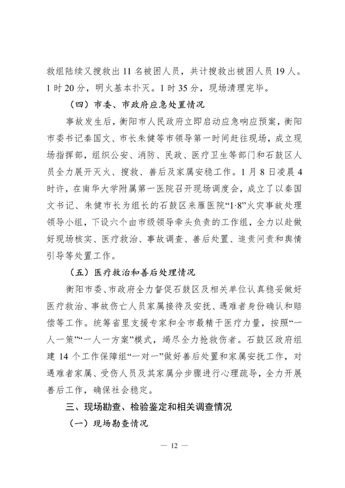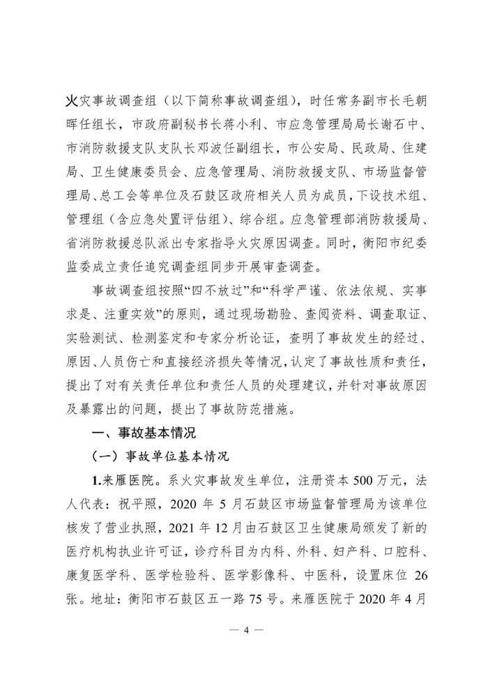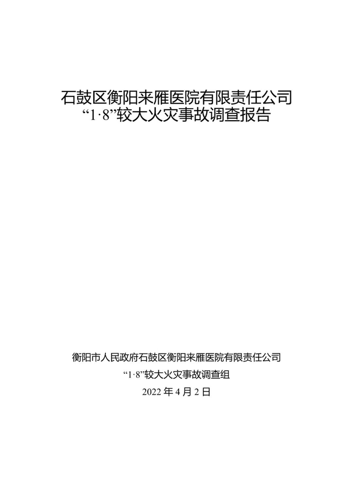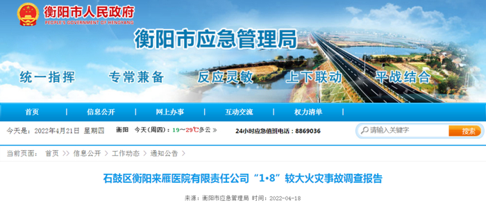 近日,衡阳市应急管理局在官方网站上公布了石鼓区衡阳来雁医院有限责任公司“1•8”较大火灾事故调查报告。
