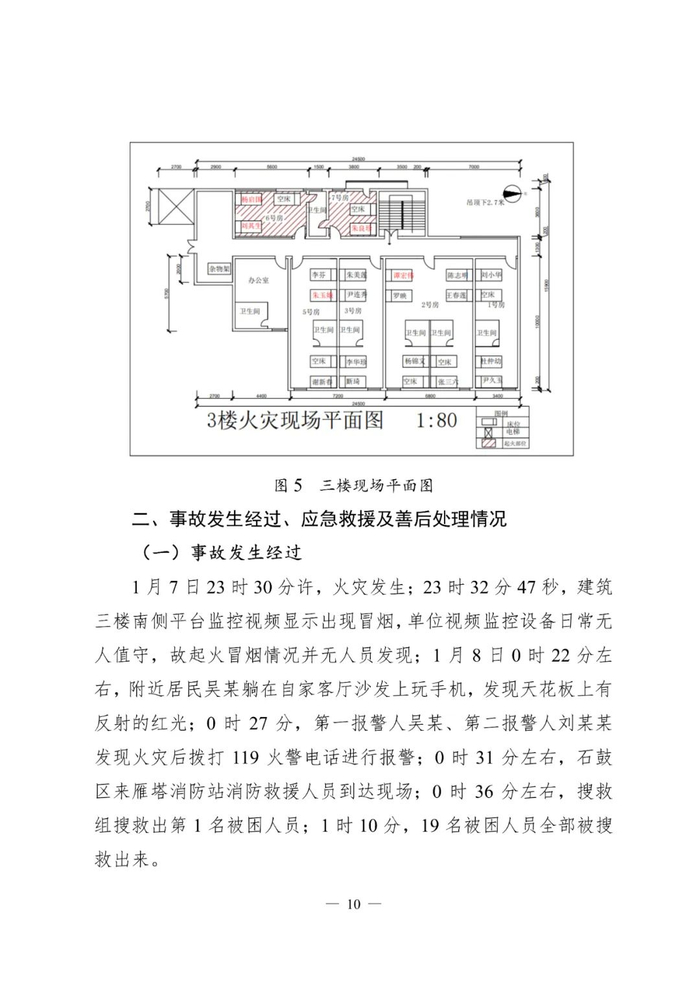1月7日23时30分许,火灾发生;23时32分47秒,建筑三楼南侧平台监控视频显示出现冒烟,单位视频监控设备日常无人值守,故起火冒烟情况并无人员发现;0时27分,第一报警人吴某、第二报警人刘某某发现火灾后拨打119火警电话进行报警;0时31分左右,石鼓区来雁塔消防站消防救援人员到达现场;0时36分左右,搜救组搜救出第1名被困人员;1时10分,19名被困人员全部被搜救出来。