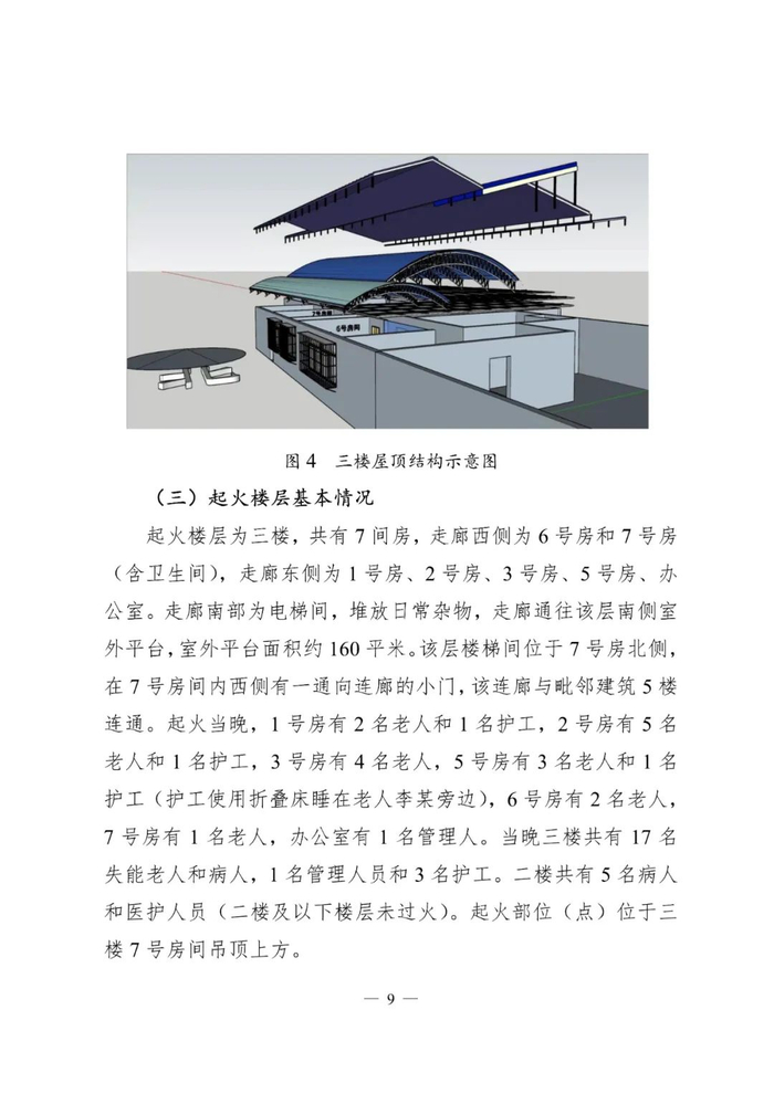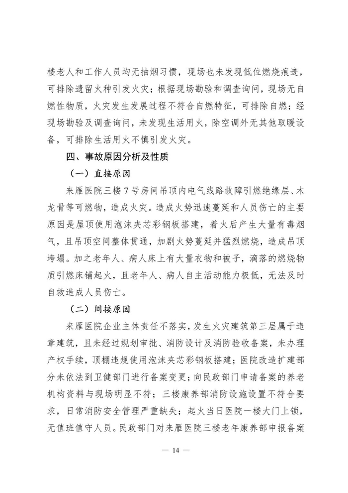 直接原因:来雁医院三楼7号房间吊顶内电气线路故障引燃绝缘层、木龙骨等可燃物,造成火灾。造成火势迅速蔓延和人员伤亡的主要原因是屋顶使用泡沫夹芯彩钢板搭建,着火后产生大量有毒烟气,且吊顶空间整体贯通,加剧火势蔓延并猛烈燃烧,造成吊顶垮塌。加之老年人、病人床上有大量衣物和被子,滴落的燃烧物质引燃床铺起火,且老年人、病人自主活动能力极低,无法及时自救造成人员伤亡。