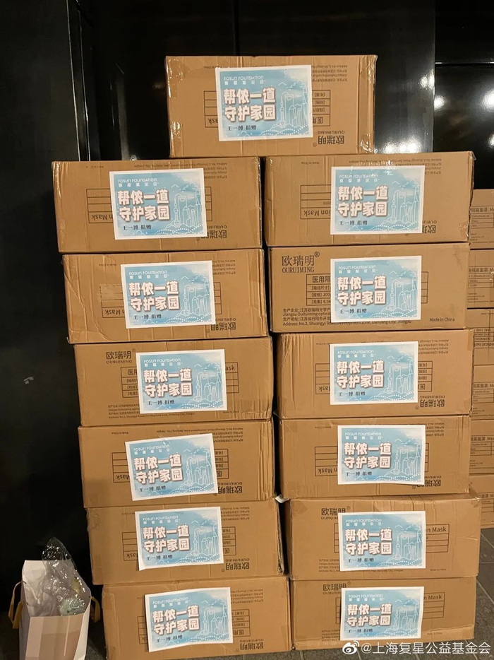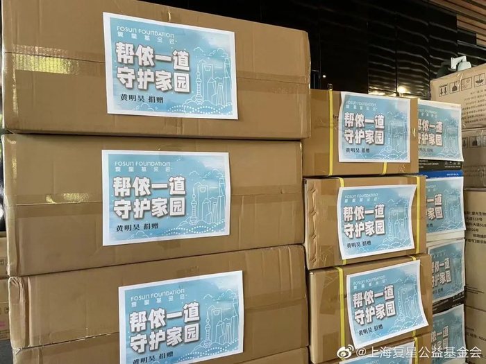 4月21日,上海复星公益基金会发布微博称,黄明昊向上海捐赠一批升级版防疫包plus,包括800件防护服、2000只医用口罩、1500双隔离鞋套、1000个防护面屏、5000只丁腈手套、900支抗原试剂。这批防疫物资由复星基金会“社区驰援”项目派送至5个社区,全部用于支持一线工作人员和志愿者,守护他们的付出。