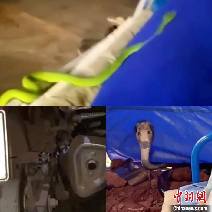 刚送走竹叶青,银环、眼镜王蛇又来了。4月15日,在山顶执勤点警用摩托车上和071联防所执勤帐篷内先后发现银环和眼镜王蛇。