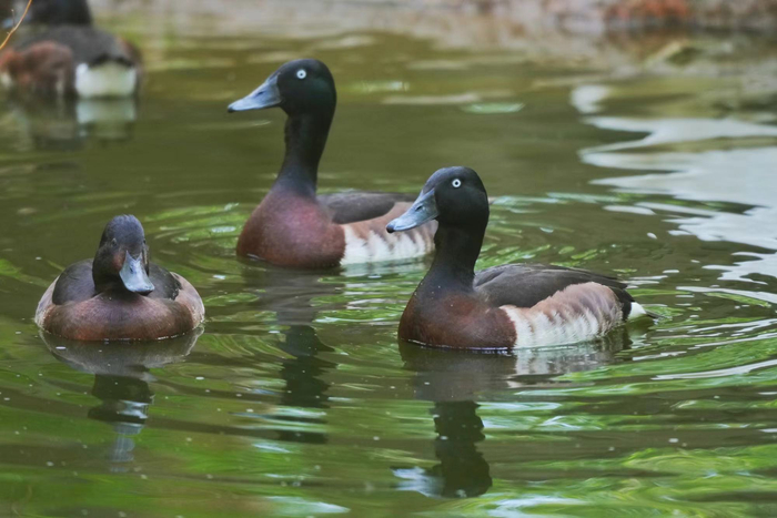如今,在北京动物园共有“三代”青头潜鸭54只,体圆、头大,雄性成年个体的头颈富有绿色光泽,眼眶亮白,胸腹之间白色、褐色和栗色的羽毛形成交错的花纹。它们体态轻盈,身姿灵活,不用在水面助跑也能起飞,还会游泳、潜水,活跃的身姿在饲养池内十分引人注目。