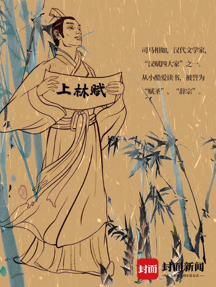司马相如也是目前可考的、文献记载的、四川出现的第一位文化名人。两汉以赋体著称,其文风辞藻华丽、用典繁杂,现在读来通常艰深,可见作者需要极其渊博的学识。司马相如的《上林》《子虚》二赋,气象万千,巨丽壮观,恢弘的西汉景象跃然纸上,因此成为汉赋的标志,也成为后世写赋的标准,影响了百代人对汉代辞赋的评价。