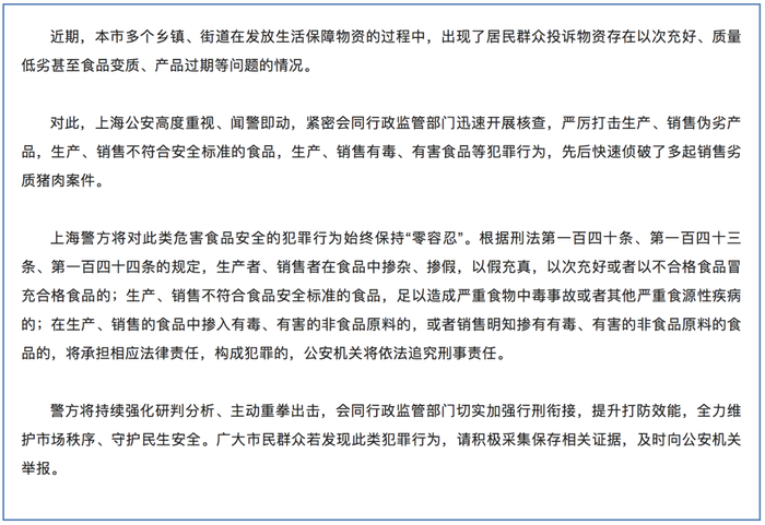 上海公安局:上海公安严厉打击生产、销售伪劣产品,生产、销售不符合安全标准的食品,生产、销售有毒、有害食品等犯罪行为,先后快速侦破多起销售劣质猪肉案件。上海警方将对此类危害食品安全的犯罪行为始终保持“零容忍”。