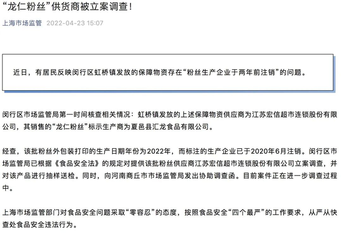 对于居民反映的上海闵行区虹桥镇发放的保障物资存在“粉丝生产企业于两年前注销”的问题,闵行区市场监管局表示:“龙仁粉丝”供货商被立案调查。