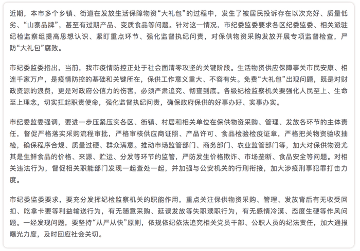 上海市纪委监委:近期,上海市多个乡镇、街道在发放生活保障物资“大礼包”的过程中,发生了被居民投诉存在以次充好、质量低劣、“山寨品牌”,甚至有过期产品、变质食品等问题。针对这一情况,上海市纪委监委要求各区纪委监委、相关派驻纪检监察组提高思想认识、紧盯重点环节、强化监督执纪问责,对保供物资采购发放开展专项监督检查,严防“大礼包”腐败。免费“大礼包”出现问题,既是对财政资源的浪费,更是对政府公信力的伤害,必须严肃追究、彻查到底。