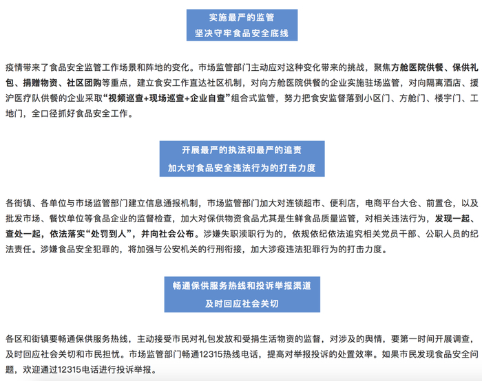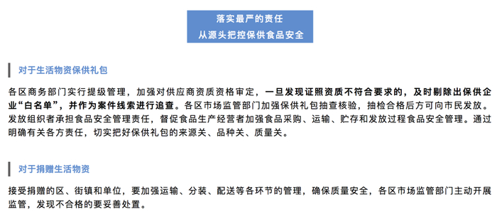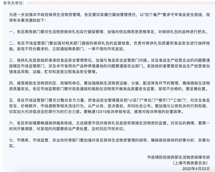 据上海市商务委员会:①对生活物资保供礼包实行提级管理,加强对供应商资质资格审定;②对保供礼包质量和食品安全进行抽样检验。发现不符合要求的,立即通报商务部门,一律不得向市民发放;③上海要求畅通12315电话,提高对投诉举报的处置效率;④保供礼包发放组织者承担食品安全管理责任。