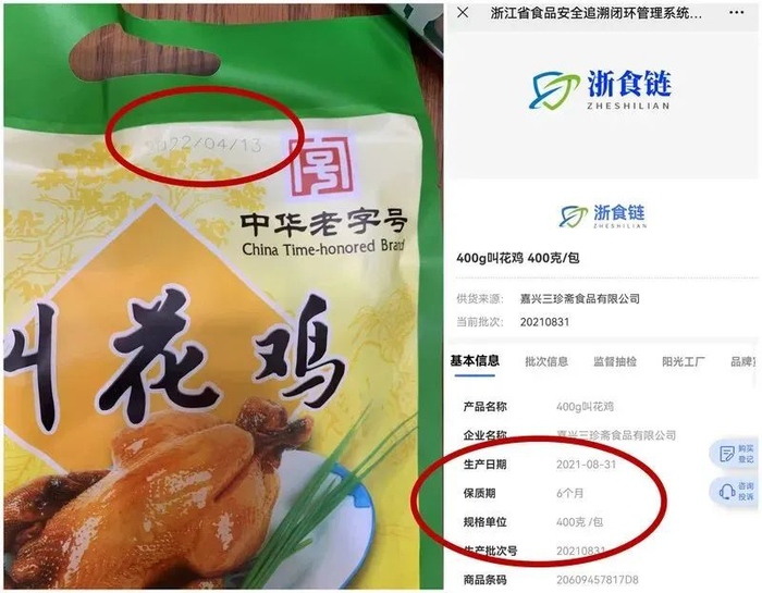 对于浦东、普陀等区居民反映的叫花鸡过期的问题,嘉兴三珍斋食品有限公司表示,市场监管部门已介入,公司将积极配合,及时还原事实,一定依法对自身产品负责,恳请各方监督。