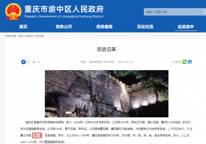 很少有人知道,渝中区也曾被叫做“垫江”。上游新闻记者在渝中区政府官网“渝中区历史沿革”看到,“渝中区是重庆市的母城和发源地,距今(2022年)已有3000多年的历史。从汉代至清代,先后属江州县、垫江县、巴县地域。从公元561~1929年,属巴县地域历时1368年。历为郡、州、路、府、省、县治所所在地。”