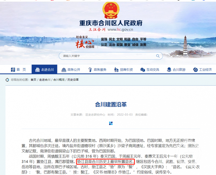 上游新闻记者在合川区政府官网看到,区史志研究中心考证,“垫江县是合川历史上最早所置县名,辖区包括今合川、武胜、铜梁、安岳、岳池等县地,治所在原巴子城区域。《说文·衣部》:‘褺,巴郡有褺江县。’按:褺江,《汉书·地理志》作垫江。约定俗成,误传至今。”