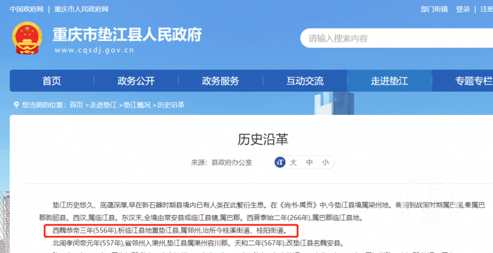 第三个垫江,就是现今的垫江县。上游新闻记者在垫江县政府官网“历史沿革”看到,“西魏恭帝三年(556年),析临江县地置垫江县,属邻州,治所今桂溪街道、桂阳街道。2008年3月,联合国地名专家组经过独立评审,授予垫江‘千年古县’的称号。垫江是首批认定的全国40个‘千年古县’之一,也是重庆唯一一个。”上游新闻记者注意到,垫江县的名字更迭只发生了一次,在北周天和二年(567年),改垫江县名魏安县。隋开皇十八年(598年),魏安县复名垫江县。