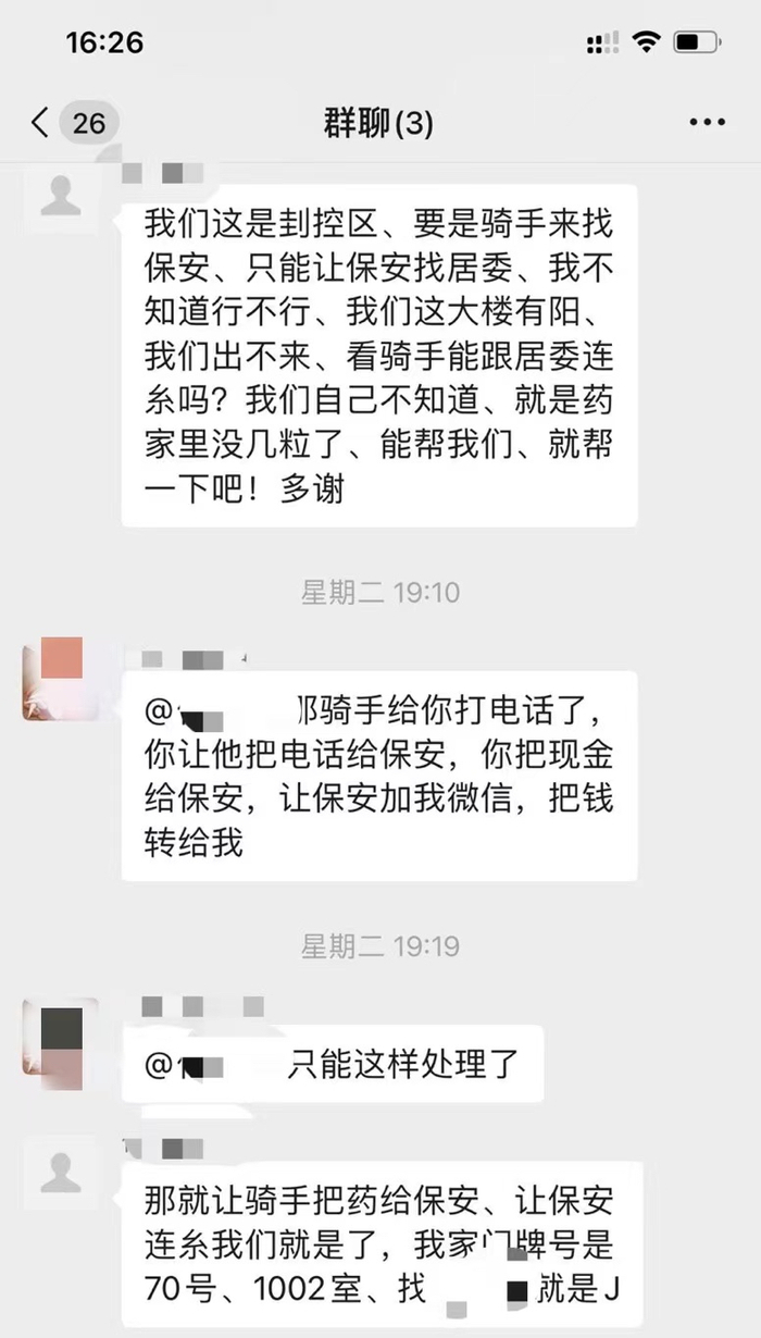 没想到,在配送前的确认环节,老人由于不会使用微信而急得团团转。鲍唯一记得,4月19日下午,老两口花一个小时才成功添加他为微信好友。他们也不会用微信转账,鲍唯一说:“阿婆你问问看隔壁邻居能不能帮你?”电话没挂断,他听到老人敲了一会门,但没人应答。他安慰老人只要药品能送到就行,钱的事来日方长。当晚十点,骑手送完这一单,老人也如愿把现金交给骑手,鲍唯一才觉得踏实了。