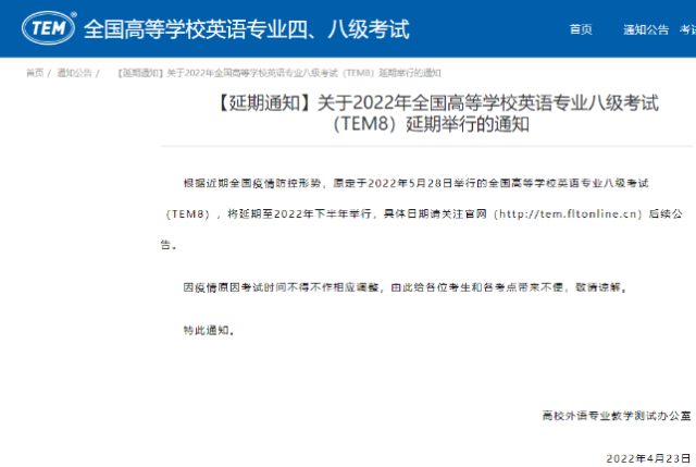 高校外语专业教学测试办公室4月23日发布通知,根据近期全国疫情防控形势,原定于2022年5月28日举行的全国高等学校英语专业八级考试(TEM8),将延期至2022年下半年举行,具体日期请关注官网后续公告。