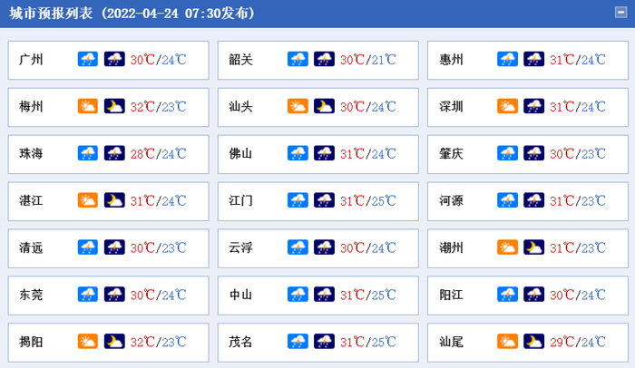 24日,韶关、清远、粤西沿海、珠江三角洲西部市县多云到阴天有(雷)阵雨局部暴雨,其余市县多云间阴天,有分散(雷)阵雨。最低气温:珠江三角洲大部和粤西市县22~25℃,其中市县19~22℃。
