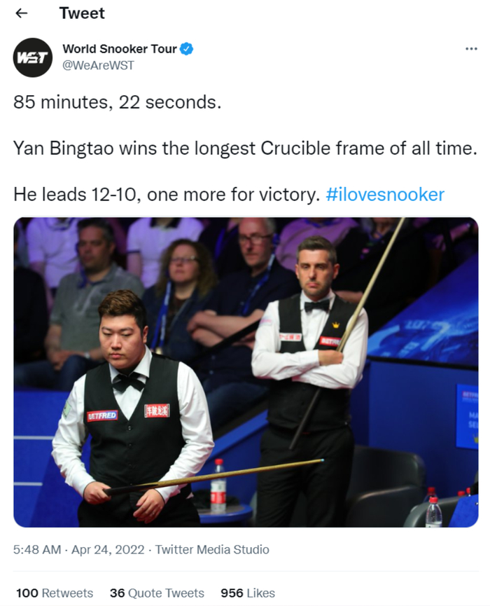 值得注意的是,颜丙涛拿下的第22局,总计耗时85分22秒。他和塞尔比联手打破了由加里·威尔逊和卢卡·布雷塞尔在2019年创下的79分半的世锦赛(决赛圈)最长对局纪录。