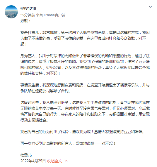新京报讯 4月25日,福禄寿乐队成员之一杜雪儿在个人社交媒体上就“2021年因走私毒品罪,被判处有期徒刑一年”发表致歉文章,并表示已退出福禄寿乐队,与乐队所在经纪公司解除合约。