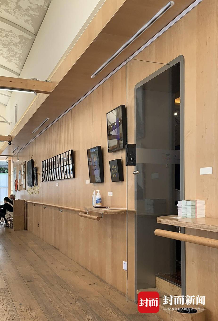 杨金惠身后的这栋木质玻璃房,就是年轻人特别喜欢的咖啡驿站,也是一个社区艺术展览空间。在房子走廊的正中间,有一道不足一米宽的玻璃门,推开这道门就是玉林东路社区党群服务中心一楼大厅。