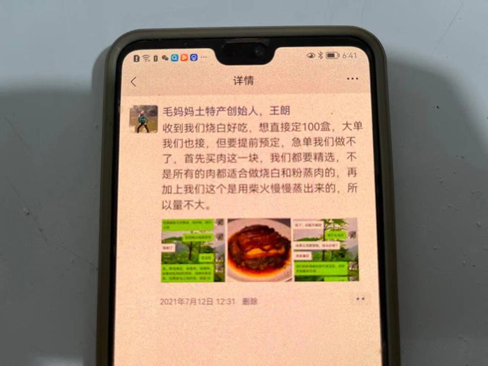 接到大单的王亚琼很高兴,当晚发朋友圈宣传道:“感谢朋友的信任,烧白、粉蒸肉、回锅肉一样50份走起,我们一定合作得非常愉快,吃我们毛妈妈土特产放120个心。”