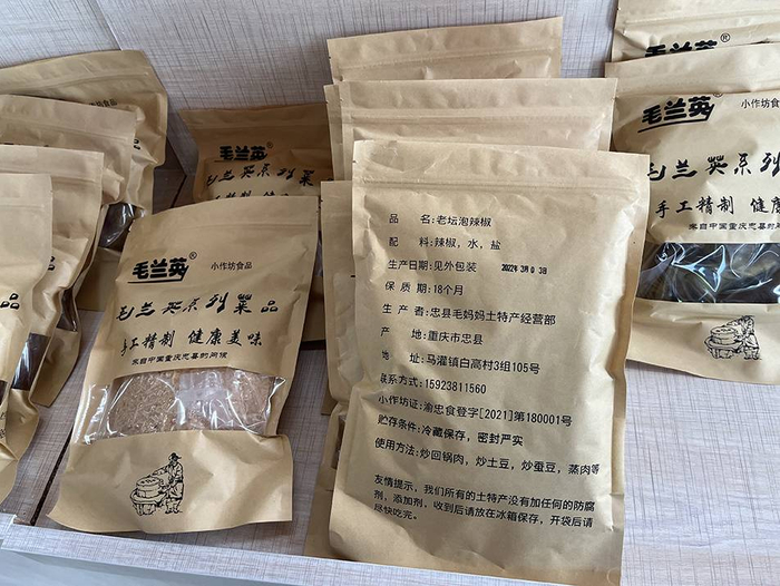王亚琼介绍,她的客户以忠县居民为主,也有在云南、新疆打工的老乡馋家乡美食,也在王亚琼那里买咸菜。王亚琼把咸菜包装好,寄给客户。后来,她又和婆婆商议,纯手工制作一些麦酱、辣椒拿去卖。