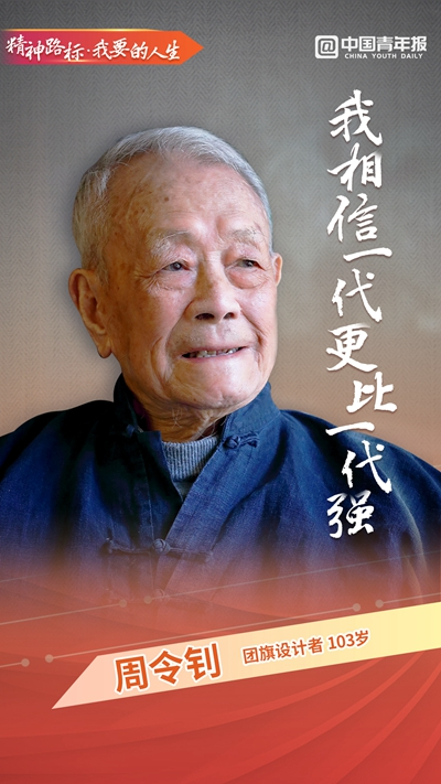 旗帜是信仰,是方向,是力量。1949年4月,新民主主义青年团第一次全国代表大会决定制定团旗,设计者周令钊立足“青年团是党的助手和后备军”这一定位,以简单、鲜明的设计表达青年团是党领导下的先进青年的组织,青年团结在党组织的周围。以旗帜凝聚青年,指引青年,形成了鲜明的精神路标。不同的历史时期,党组织对团的要求有所变化,但始终党旗所指就是团旗所向,凝聚了一批又一批青年接续奋斗。近日,中青报·中青网记者专访了103周岁的周令钊。