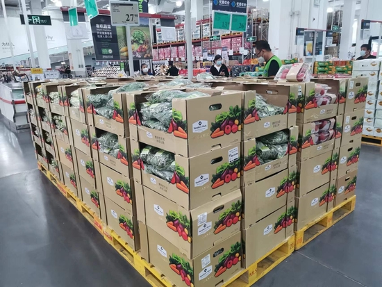今晚8时许,北青社区报记者在位于后沙峪镇的山姆会员店顺义店看到,菠菜、油菜、胡萝卜、紫甘蓝等新鲜的蔬菜满满地摆放在货架上,工作人员还不时进行补货。在肉类销售区,新切割包装好的五花肉、前排肉、里脊肉以及猪肋排、猪扇骨、前腿骨、后腿骨等应有尽有,虾仁、鸡胸肉等冻品肉类供应量也十分充足。此外,米、面、粮、油等货架内,商品摆放整齐。店内也并未出现采购潮,大部分顾客都是正常采购、消费。