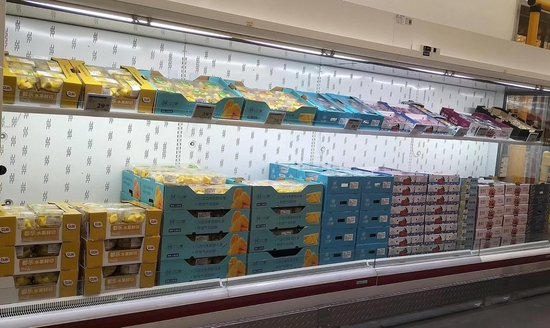 一盒盒鲜切水果摆在货架上,等待居民选购。